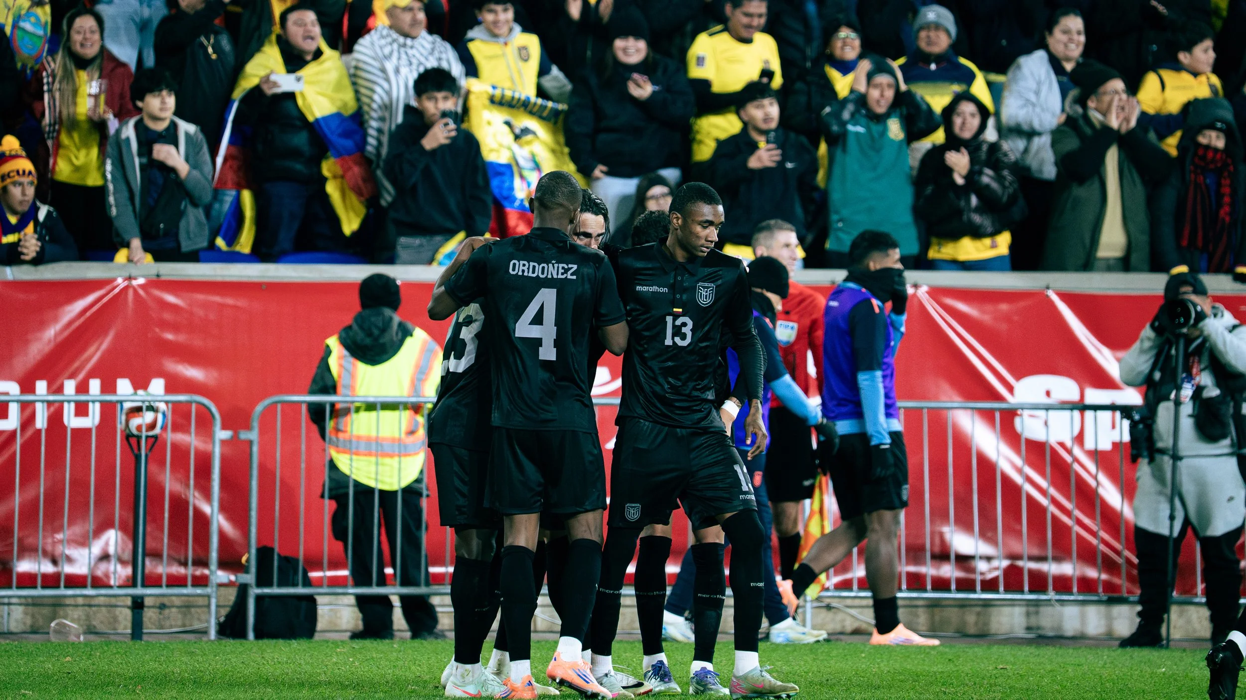 Leonardo Campana’s teammates surround him after he scores vs New Zealand at Sports Illustrated Stadium on November 18, 2025.