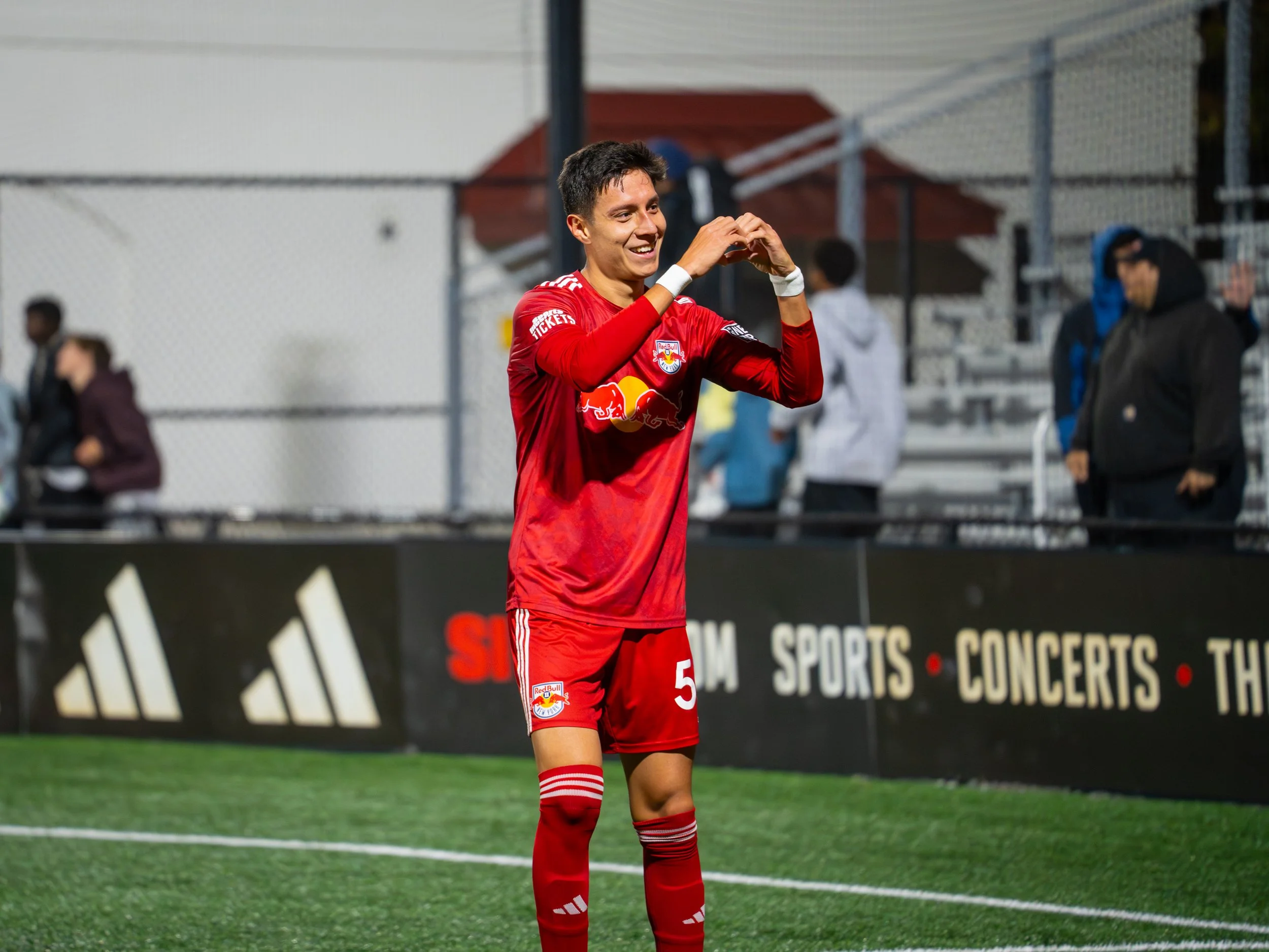 Jair Collahuazo celebrates after scoring a header before halftime for Red Bulls II at MSU Soccer Park on October 25, 2025. Photo by Claire Johnson.