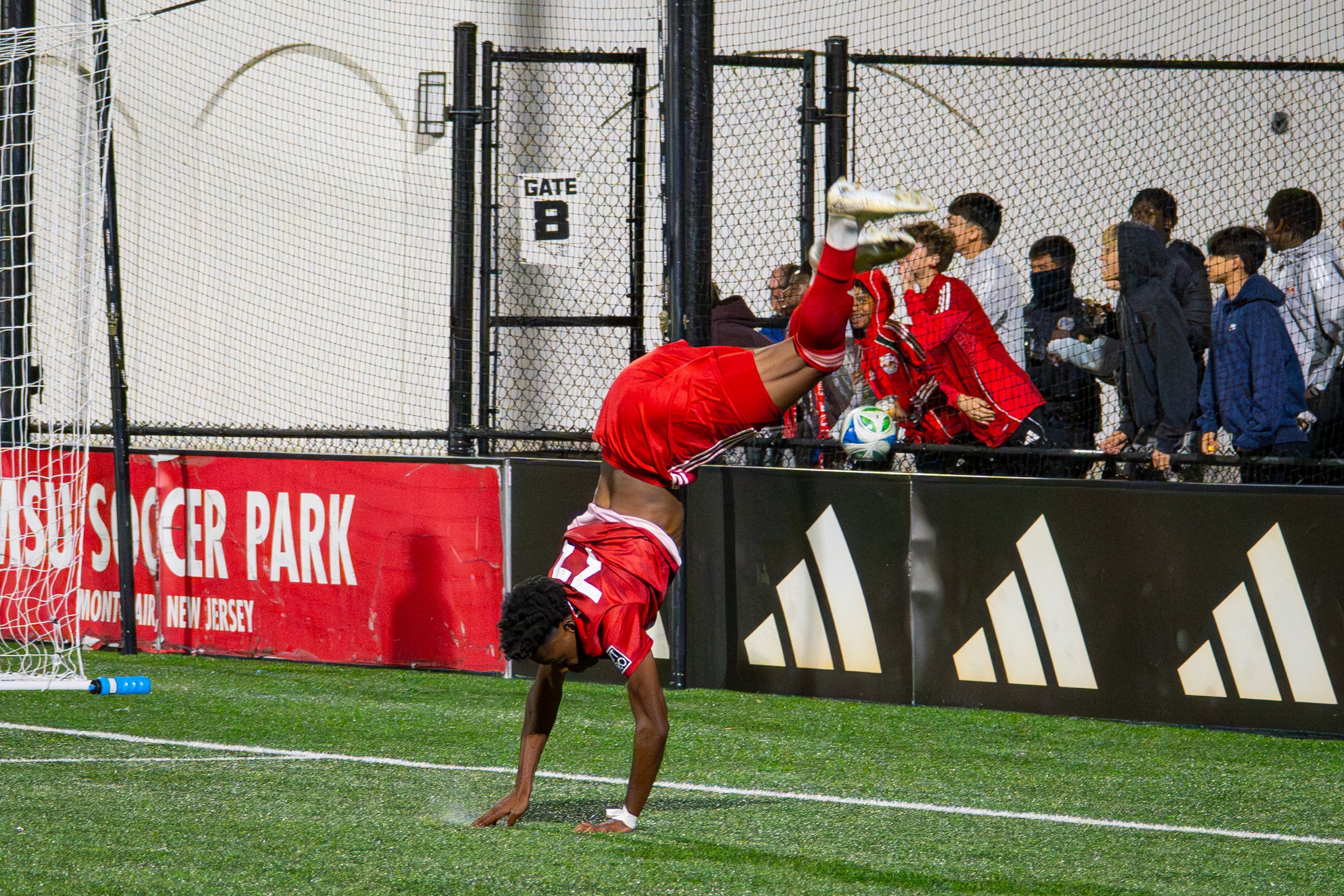 Roald Mitchell celebrating after he scores for Red Bulls II at MSU Soccer Park on October 26, 2025. Photo by Claire Johnson.