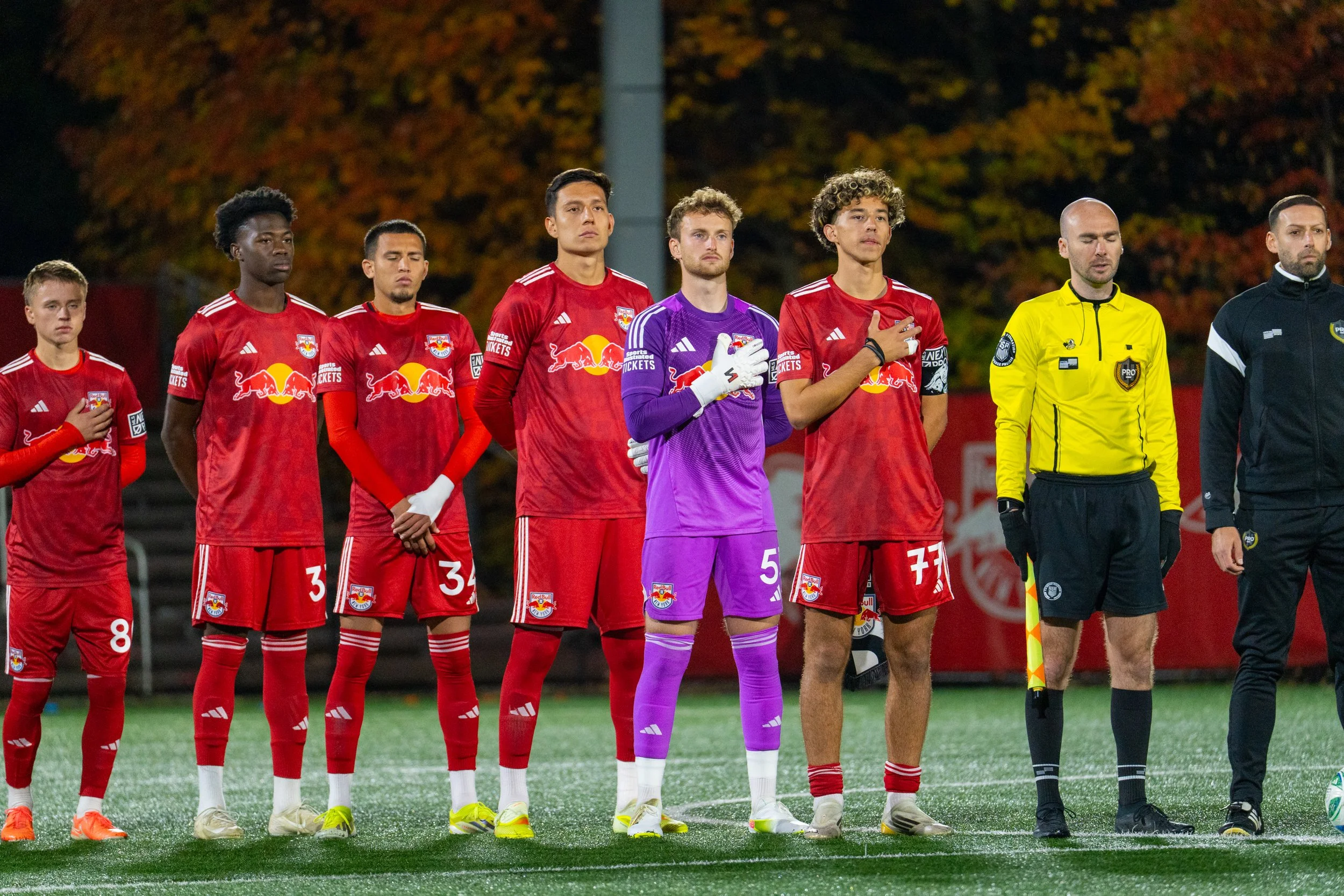 Red Bulls II players stand for the national anthem before their MLS NEXT Pro match against Chicago Fire II at MSU Soccer Park in Montclair, N.J., on Oct. 26, 2025. Photo by Claire Johnson.